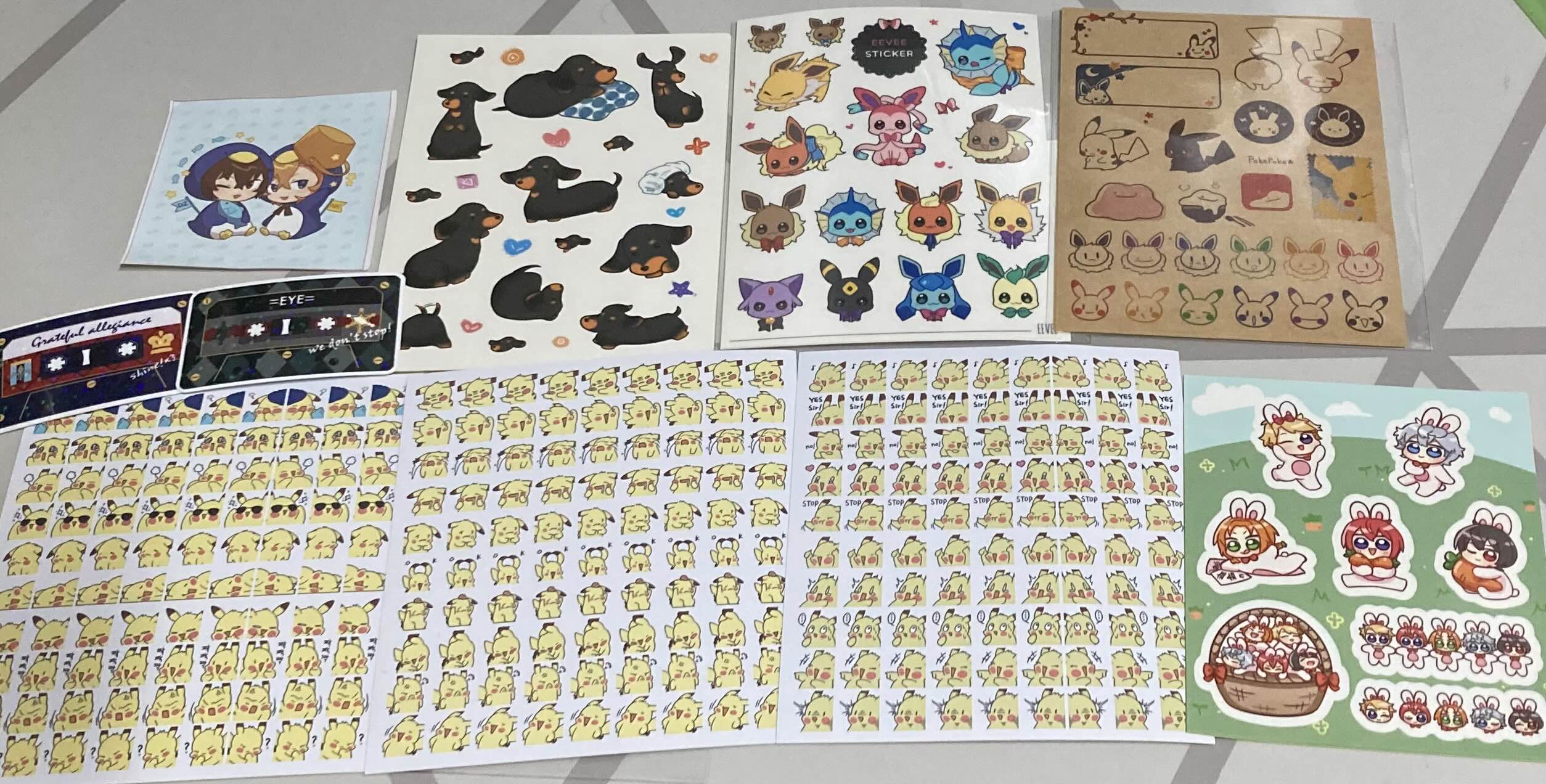 친구가 키우는 강아지와 매우 똑닮은 스티커🐾 부터 시작해서 이브이 시리즈, 피카츄 칭구들, 다자이-츄야, 앙스타 유닛 카세트테이프 모양 스티커, 토끼나이츠, 누군가의 부스에서 무료로 받은 토끼 스티커까지!!